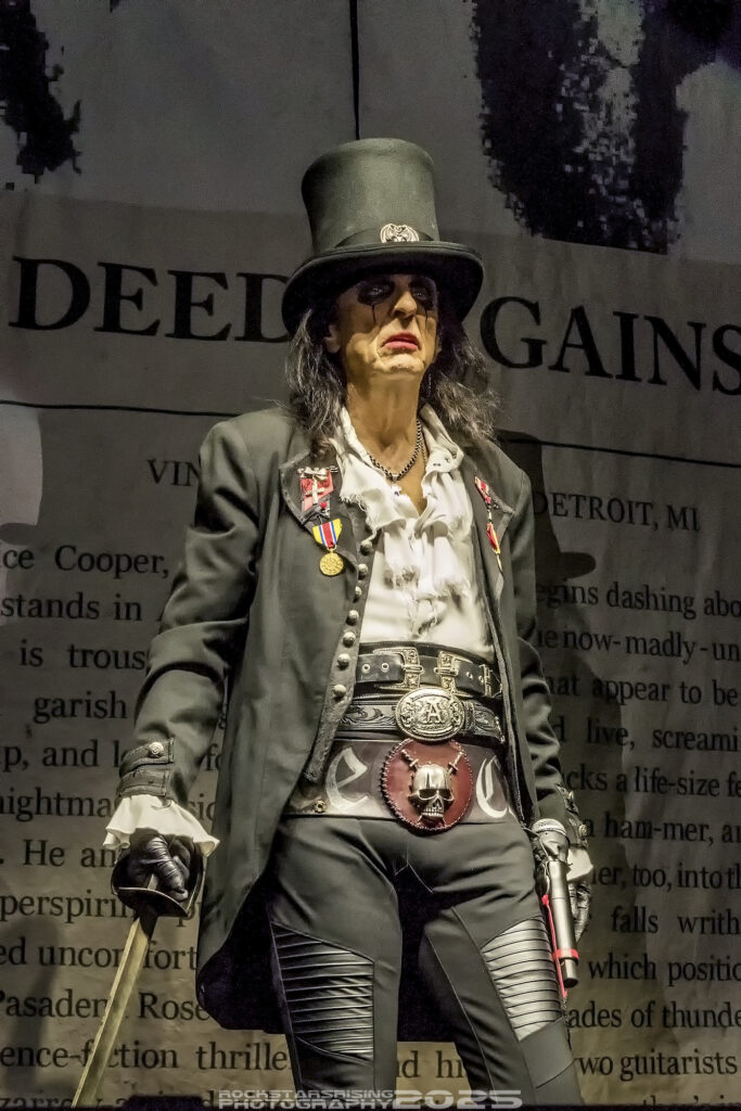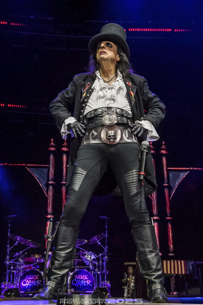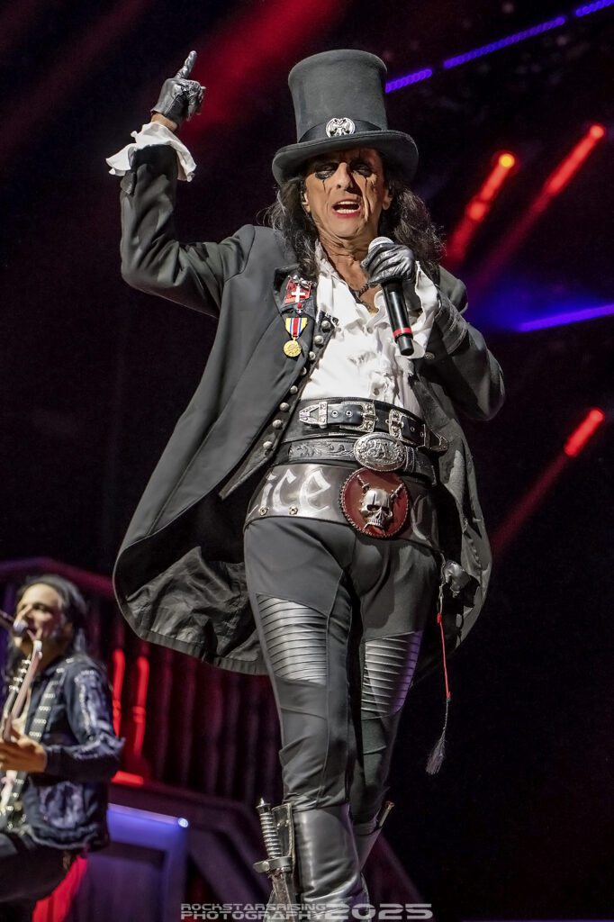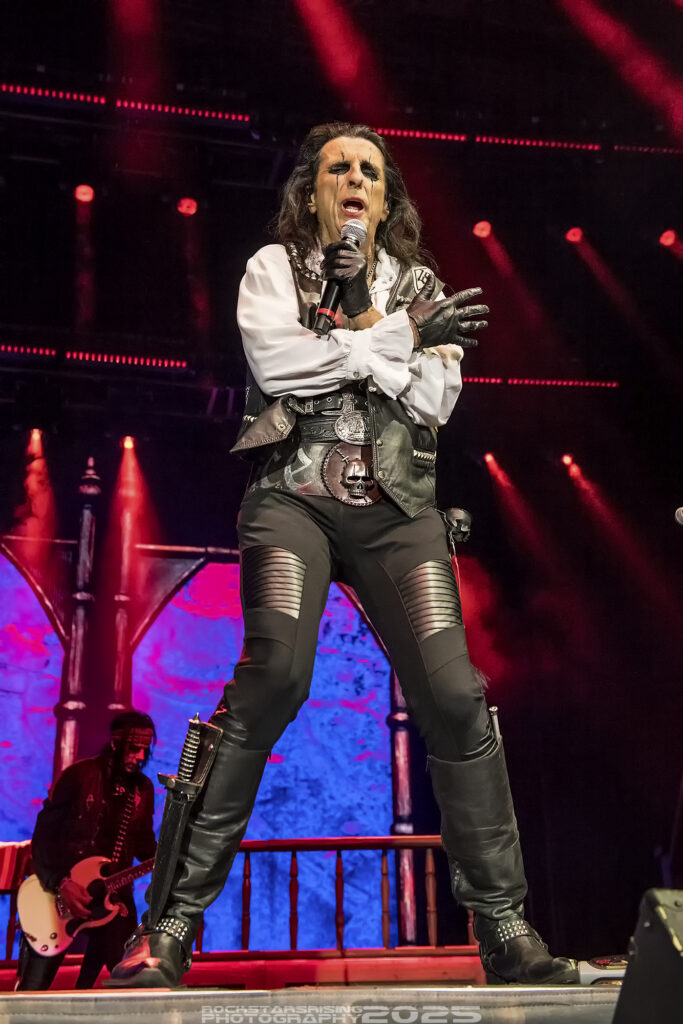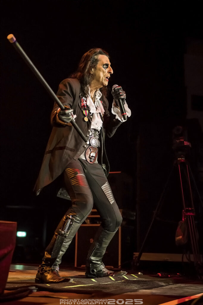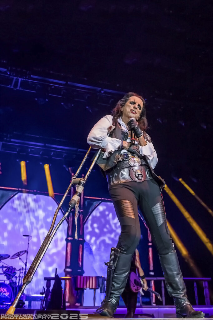 It’s time for Alice; I’m pretty sure that he’s a host from Westworld because he just doesn’t seem to slow down. Having said that the show hasn’t changed too much from the performance last year and his entrance was just the same, entering the scene through a curtain designed as a newspaper page after two bell-ringing plague doctors prowled across the stage. This did nothing to dishearten his fans, however, as they audibly welcomed him to the stage. The stage is set up with staircases at each side and a row or projected images and live feed at the rear. He kicks off the show with Lock Me Up from Raise Your Fist and Yell (1987). “Don’t want to be clean, don’t want to be nice . . .” he sings and follows with “I’m gonna be rough, I’m gonna be mean . . .” which just about sums up the show to come. Welcome to the Show and No More Mr. Nice Guy follow before he picks up a trademark wooden crutch for I’m Eighteen, one of the very first songs I remember.