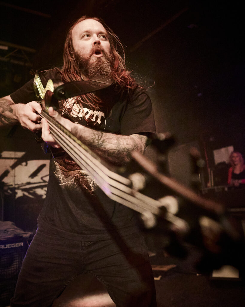 After a few more strong songs from 2002 album Infiltrate Destroy Rebuild, Chad – seeing the smiling faces in the crowd grabs the mic to introduce ‘Flesh Into Gear’ and shouts “C’mon guys, what you lookin’ so happy for?… you’re dealing with a massive narcissist, remember?!”, referencing the dispute with Blackgold last week. From his general demeanour and stage attire (hoody up, shades on), he gives off the aura of someone who doesn’t give a f*ck. That may or may not have been interpreted as supreme arrogance and self-importance by some in the past, and honestly I have no idea whose side of the story to believe about the aforementioned. All I know is that it’s going down really well with the Sheffield crowd tonight. Mike Leon is animated in his bass playing, clearly enjoying his new band and acting the goat a little. He was a longtime fan of CKY and seized the opportunity to join this year – and I believe he’s enjoying the lighter hearted side of rock, having been in a straight up metal band for the last few years.