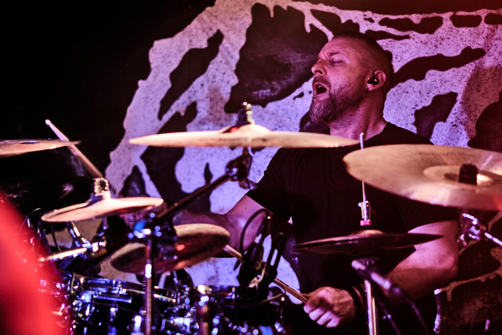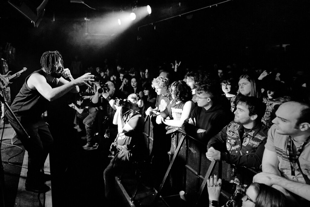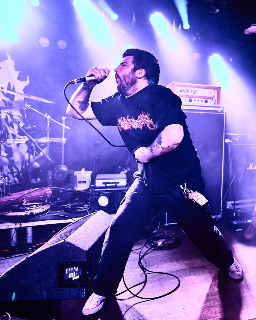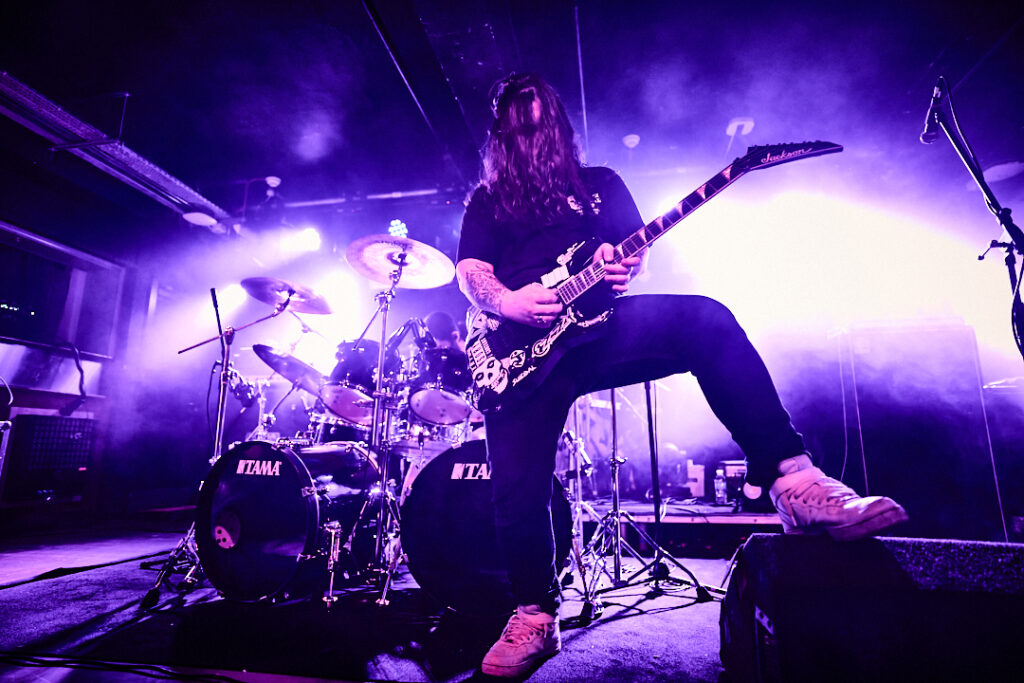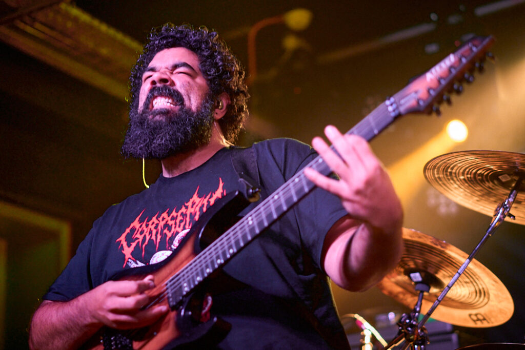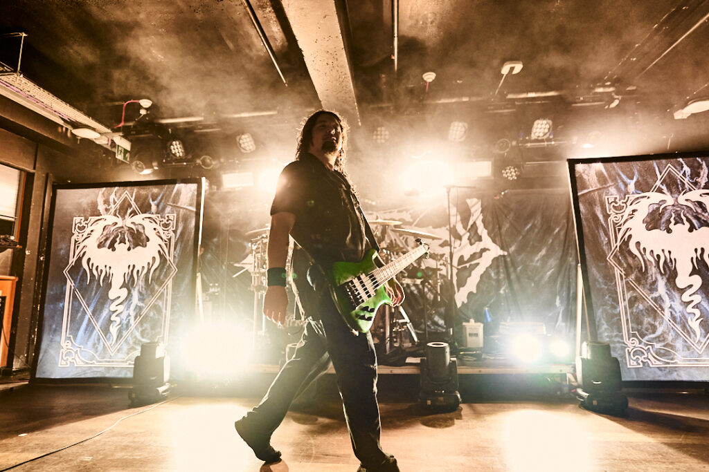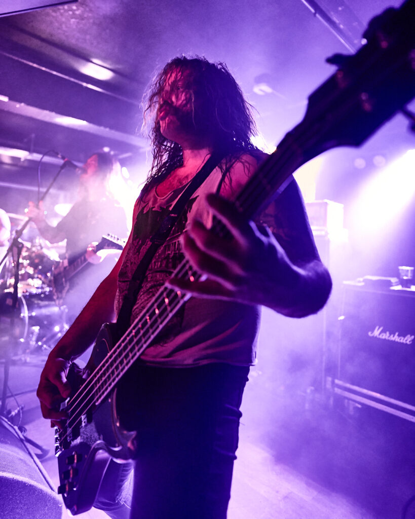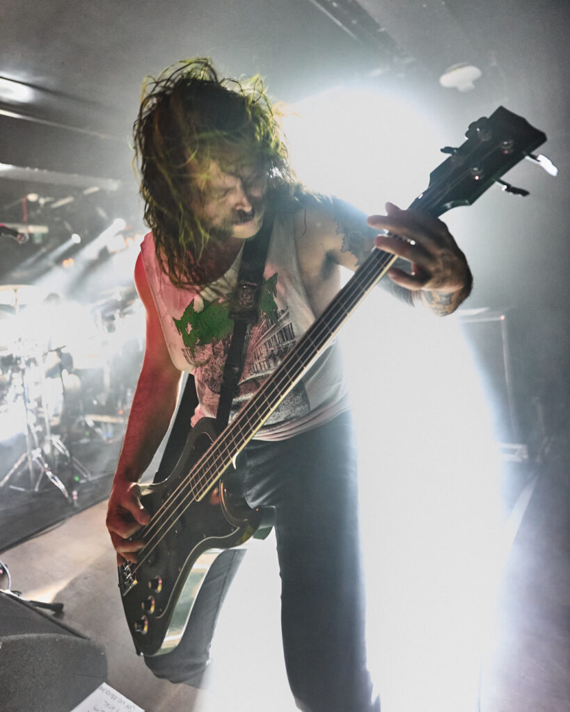 First up are Chat… no sorry, Corpse Pile. Metal does appear to have ‘Piles’ at the moment and, Christ, could this lot tear your arse a fresh hole! Lurching guttural vocals, frequent tempo changes, and a particularly dirty low-end bass give a surprising groove to the sound that I can best describe as ‘Gore-slam’. Everyone loves a beatdown and so there’s plenty of moshing and slam dancing in the crowd right from the get-go. Corpse Pile have already got things off to a wild start! Perennially pissed off, vocalist Jason Frazier declares they’re from the ‘United shithole of America’ – and they’re clearly not proud of it. He proceeds to decry everything from Elon Musk, transphobes, Trump, to even pavements (sorry ‘sidewalks’) or rather Texas’s lack of them. By the end, they could have squeezed another song in without so much talk, but they have a working-class ethos, are proud of it and their passion is to be admired. A raucous and ready crowd gleefully cheer on closing number ‘Us vs Them’ – with those new to the party (such as me) suitably impressed.