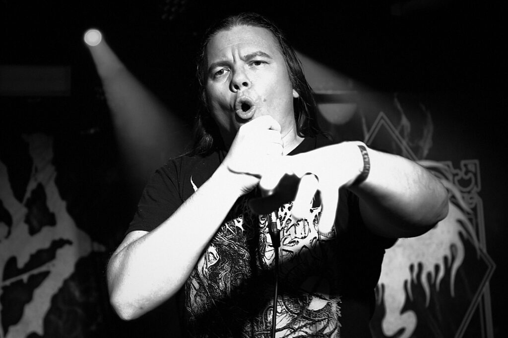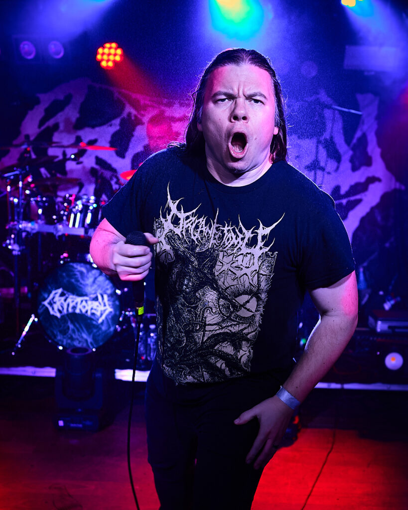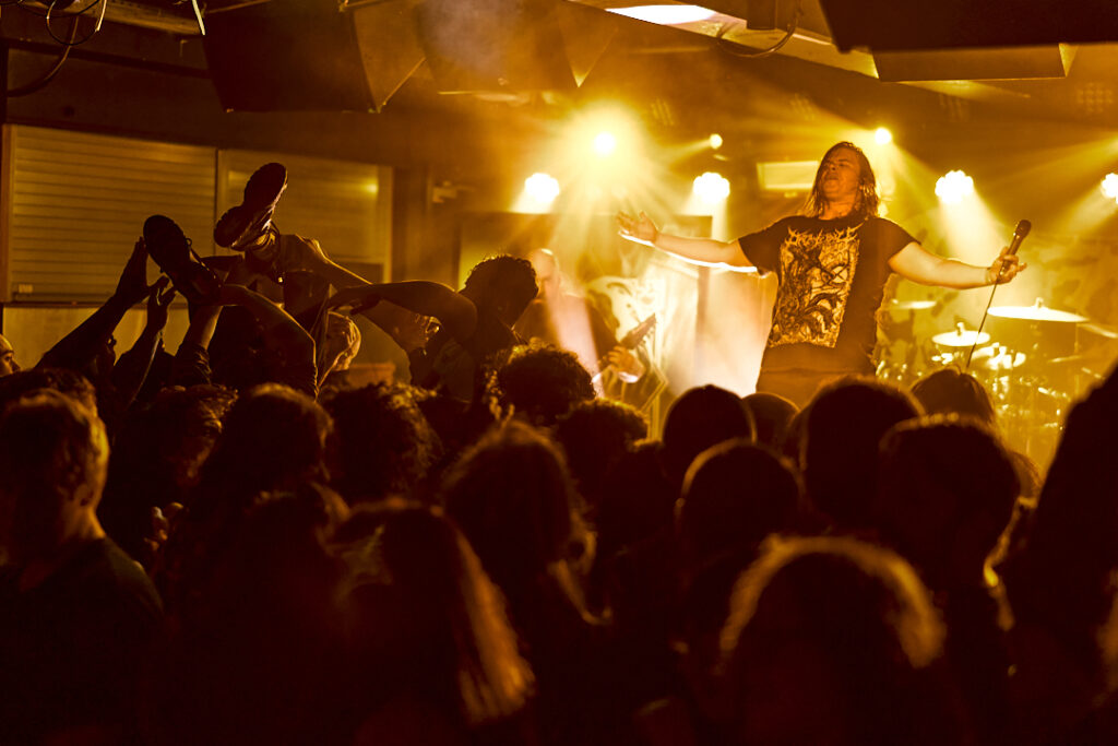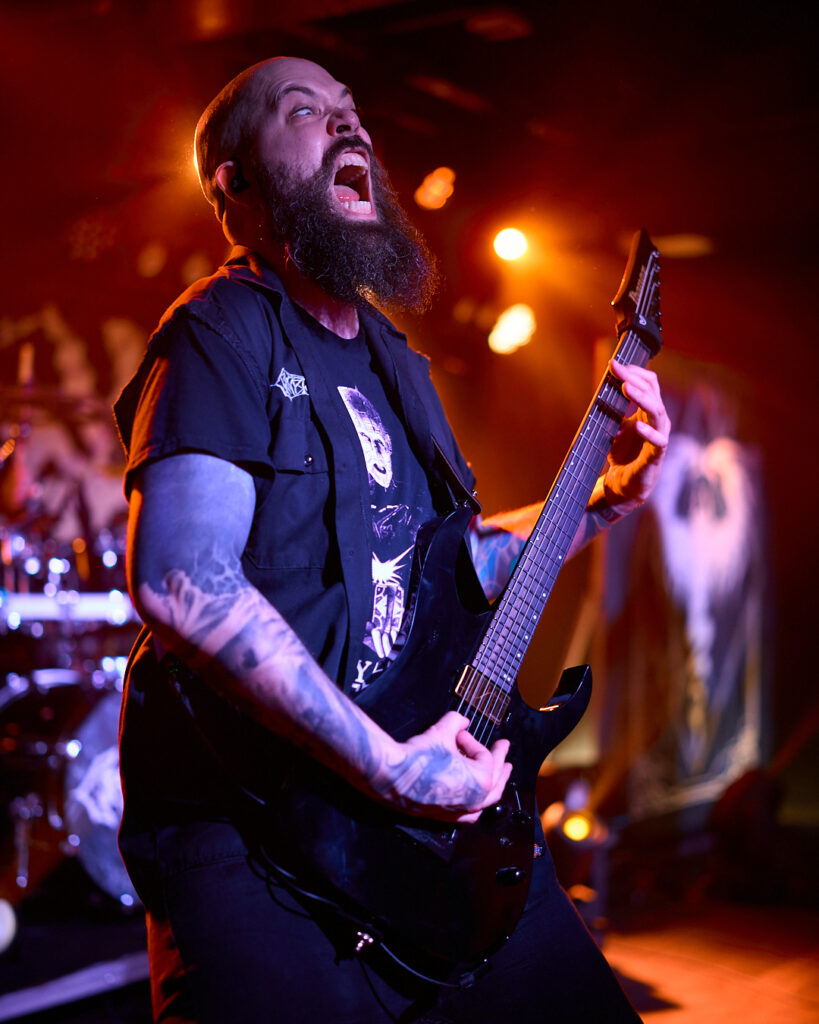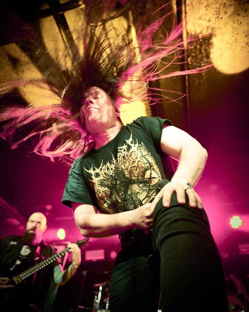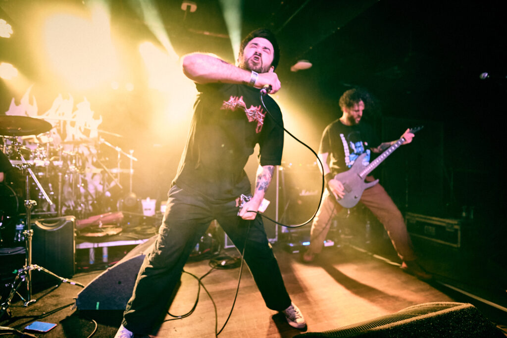 200 Stab Wounds are up next and there’s already a main event feel about the place. More of the crowd have come forward and it really is packed! The set starts with ‘Hands of Eternity’, lead off track from their most recent album ‘Manual Manic Procedures’, and we are off to the races at more than a canter! It’s gore-themed mid to fast paced brutal OSDM, incorporating breakdowns and a thick modern guitar sound. The crowd are going nuts and suddenly space becomes literally, a pressing factor! A criticism of this venue is that there’s nowhere else to really go during a squash pit – as the wide pillars towards the back of the room negate most of the raised space. As such there’s no point moving anywhere, so all I can see are occasional glimpses of guitarist Raymond MacDonald’s bare left nipple, or the odd shot of his face looking like an electrified Kyle Gass! What little I can see is more than made up for by what I can hear – and also what I can feel! There’s a groove to much of what 200 SW do, with hardcore elements mixed in that are reminiscent of Chaos AD-era Sepultura, and it makes the impact of their heavier screaming thrash parts even more impactful when they come back in. It’s everything that’s good about this style of music, and fan favourites ‘Skin Milk’, ‘Tow Rope Around The Throat’, ‘Itty Bitty Pieces’, and set closer ‘Release The Stench’ leave the crowd exhilarated and thirsty for more. And they’ll get it!