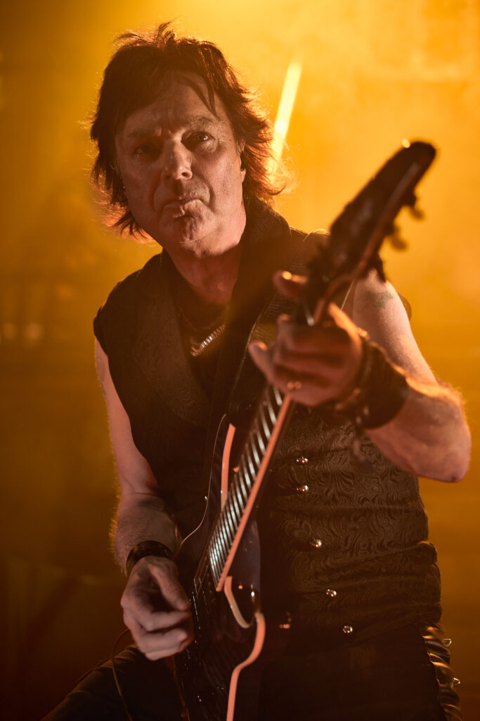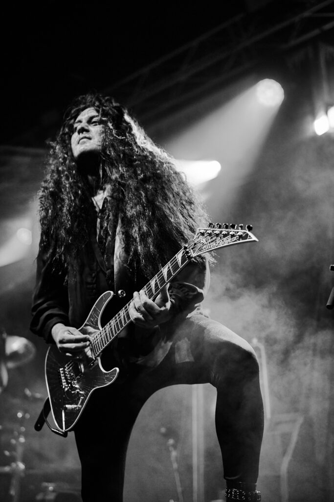 King alternates between low end growls and snarls, and his trademark inimitable falsetto, and at age 69, it’s no mean feat. His femur bone microphone stand further adds to the visual spectacle. Kim Bendix Peterson a.k.a. King is of course the superstar, but he is flanked by some of the most technically accomplished musicians in metal, with Andy Larocque gettings the biggest cheer when King introduces the band.