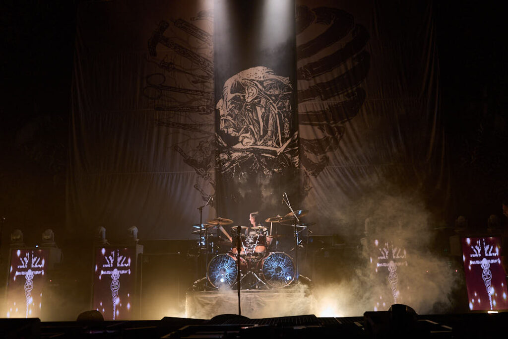 Crowd favourite ‘Enemy of God’ drops quite early in the set to really ramp things up, and tickertape canons blast off to signal it’s passing. The house lights then go up revealing the true extent of their gorgeous backdrop in every intricate detail.