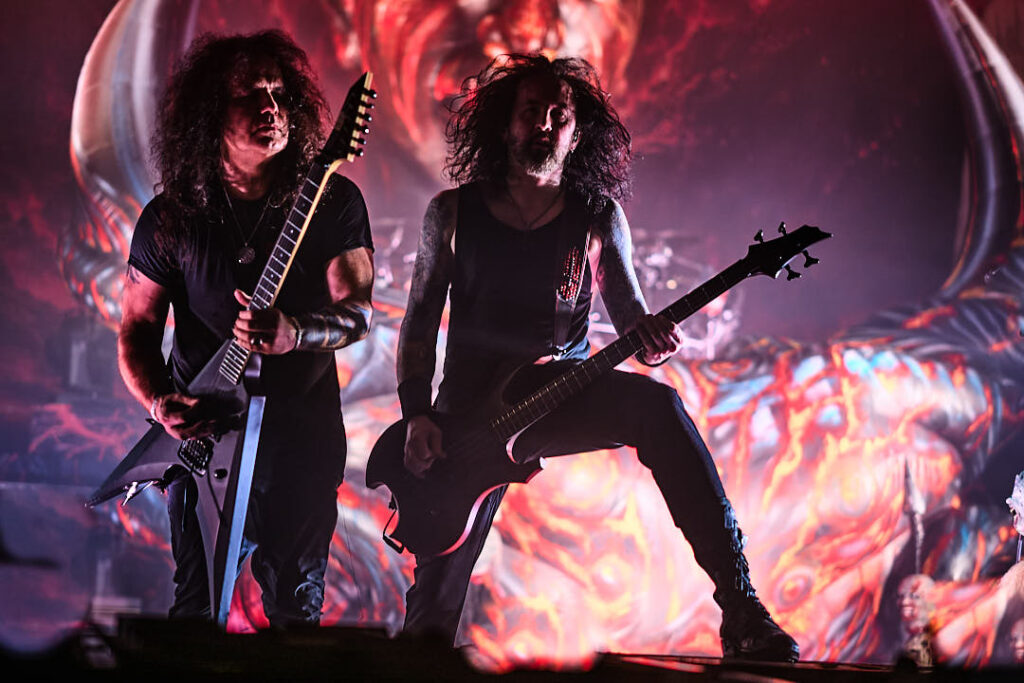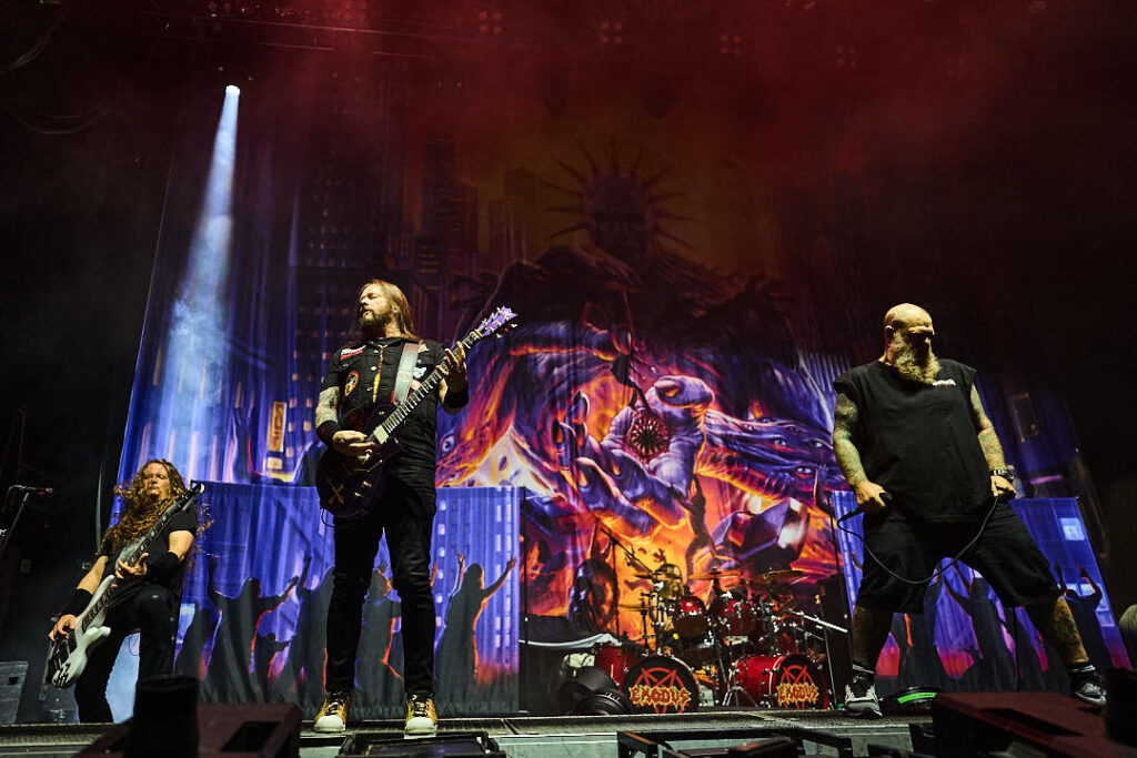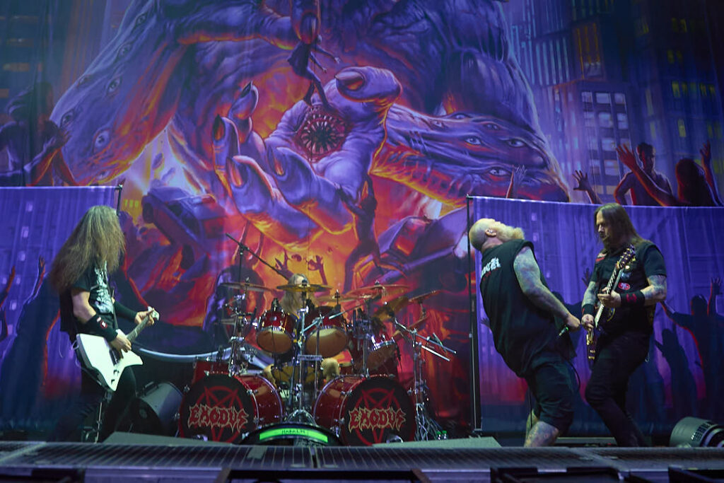 It’s a shame Nails didn’t finish with their song ‘In Exodus’ – as the Bay Area thrash outfit are up next. They’re promoting both new album ‘Goliath’ with a massive album cover backdrop behind them, and also the return of vocalist Rob Dukes following Steve Souza’s departure last year. They’ve not even started and Dukes is motioning the crowd for a circle pit so you can tell what kind of set we’re in for! They begin with ‘3111’ – first single and lead off track from the new album. It also offers an effective early opportunity for an insane guitar solo from Gary Holt which surely won’t be the last. ‘Bonded by Blood’ keeps things going, eliciting (as expected) a huge response from the crowd. It’s great to see Dukes back with them, dripping with menace as he stalks across the stage. His vocals seem a little on the quiet side however, and the sound as a whole is quite muddy. I very much doubt their timing is off so it’s a shame that the production is detracting from the performance.