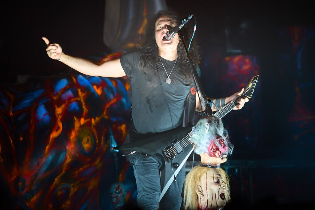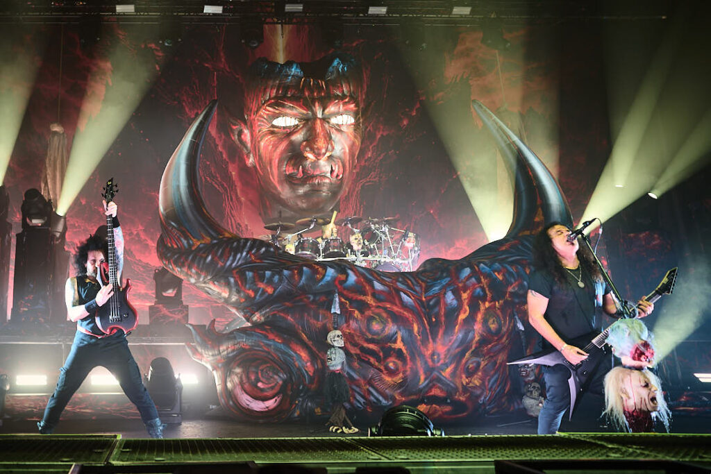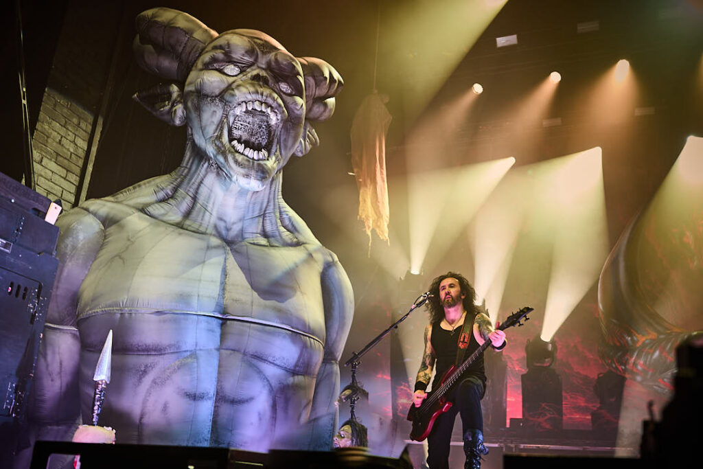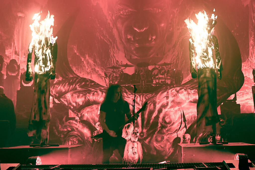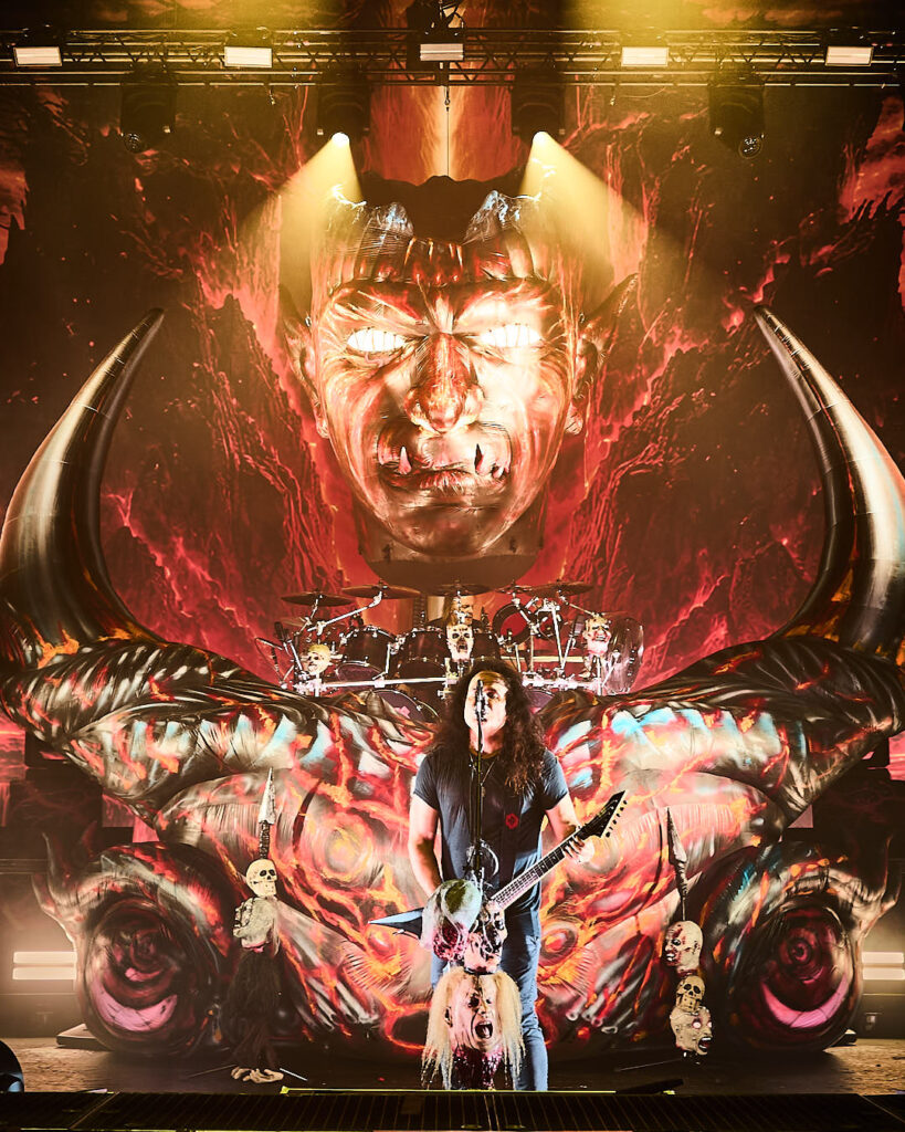 It’s now time for the Kreator to return. Their introduction video of animated ancient tapestries in conflict evolves into more modern-day images of warfare and revolt, and indicates we might be in for a fight for the ages tonight! The screen drops to reveal a stage full of grotesque gargoyles, hanging corpses, a giant bull’s head framing drummer Ventor’s kit, and the over-bearing ‘Violent Mind’ character staring out ominously at the crowd. New song ‘Seven Serpents’ starts us off in earnest, and as the pyro begins (which rarely stopped) you can tell this is a band that puts their heart and soul into everything they do.