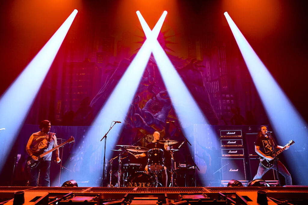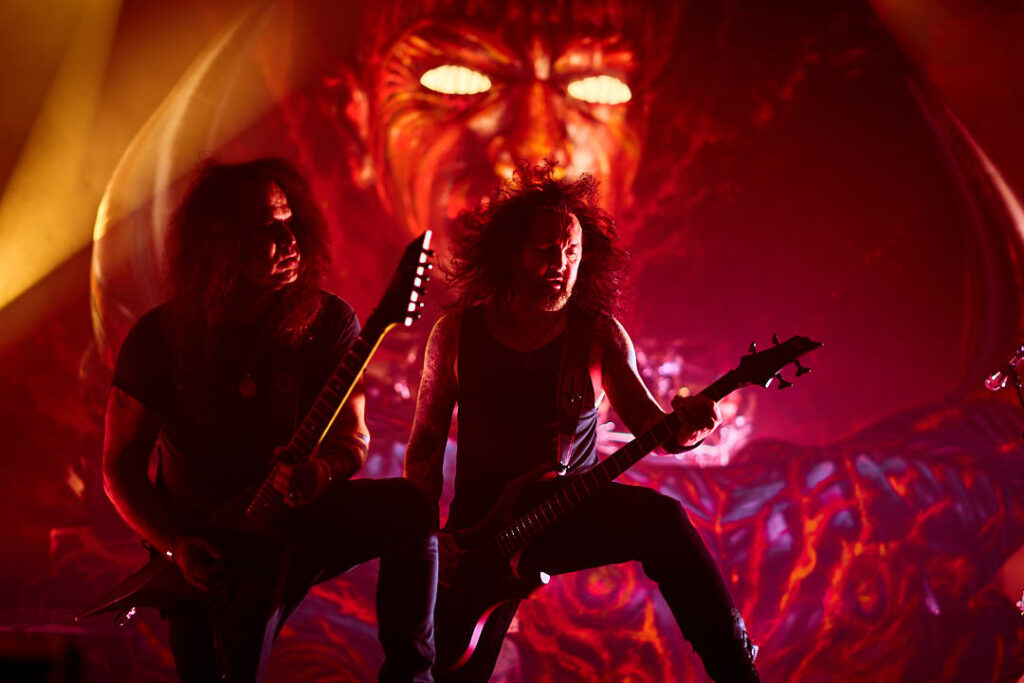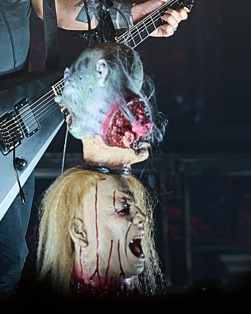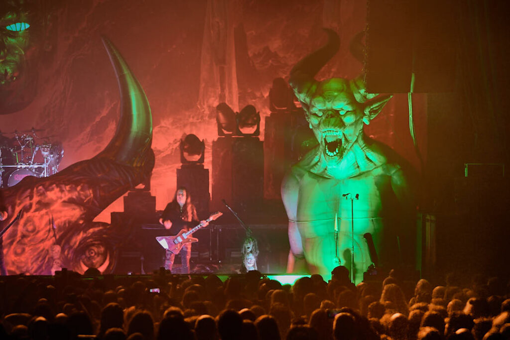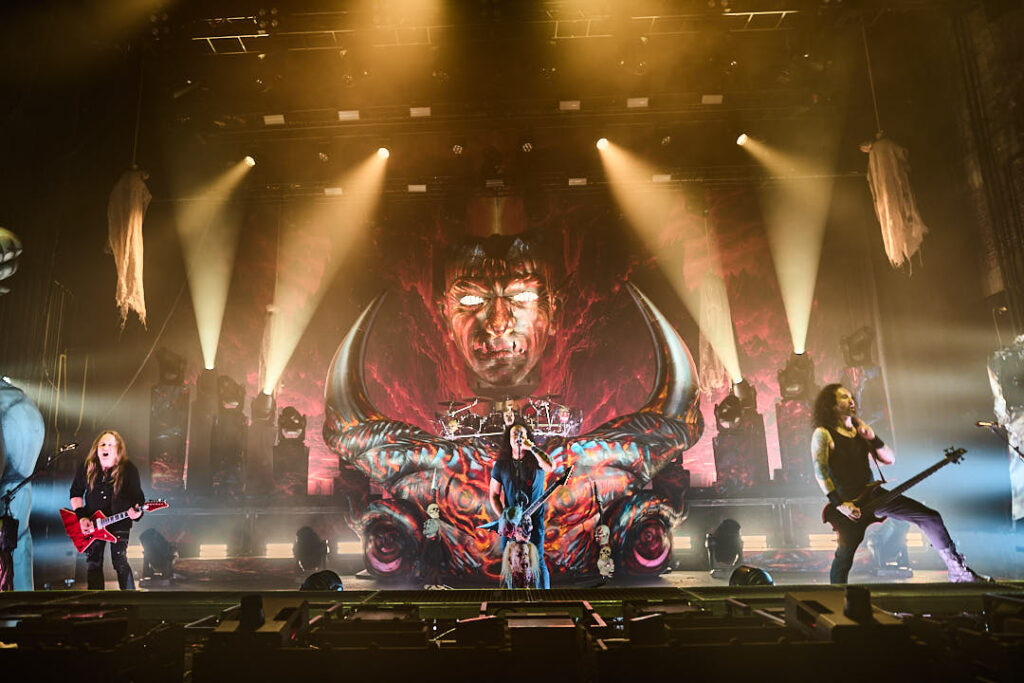 It’s now time for the Kreator to return. Their introduction video of animated ancient tapestries in conflict evolves into more modern-day images of warfare and revolt, and indicates we might be in for a fight for the ages tonight! The screen drops to reveal a stage full of grotesque gargoyles, hanging corpses, a giant bull’s head framing drummer Ventor’s kit, and the over-bearing ‘Violent Mind’ character staring out ominously at the crowd. New song ‘Seven Serpents’ starts us off in earnest, and as the pyro begins (which rarely stopped) you can tell this is a band that puts their heart and soul into everything they do.