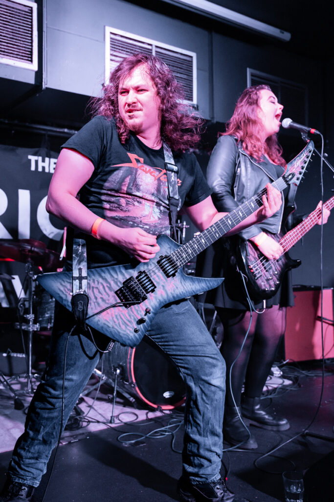 White Noise Machine return to M2TM for the third time. They are a heavy melodic trio hailing from Hampshire and slam into their set with a thumping, classic sound. Vocalist Amy Wheeler delivers clean, sharp vocals perfectly, which pierce the room and captivate the attention of the crowd. You can hear and see that this band are confident, polished, experienced performers, with great synergy between the band members, enabling them to delivery a rousing, energetic set.